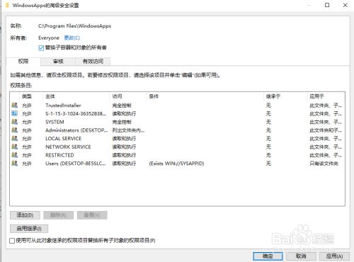 5、在“WindowsApps的高级平安设置”窗口下,勾选”替代子容器和对象的所有者”后,点击”确定“。