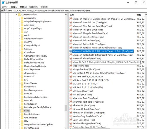 3、在注册表右侧的窗口中,找到Microsoft JhengHei & Microsoft JhengHei UI (TrueType)注册表键值