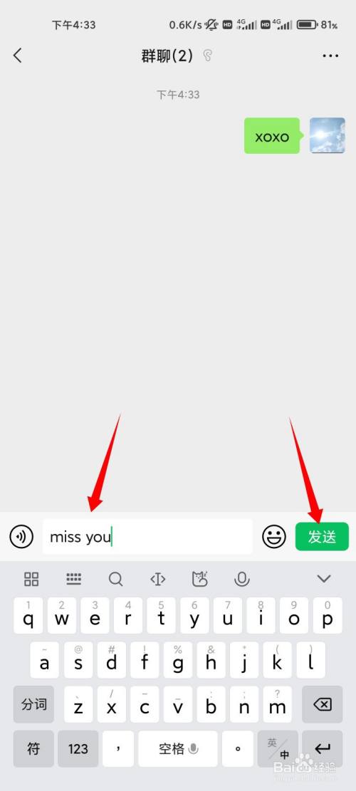 在输入框中输入我想您的英文指令miss you,点击发送的选项。