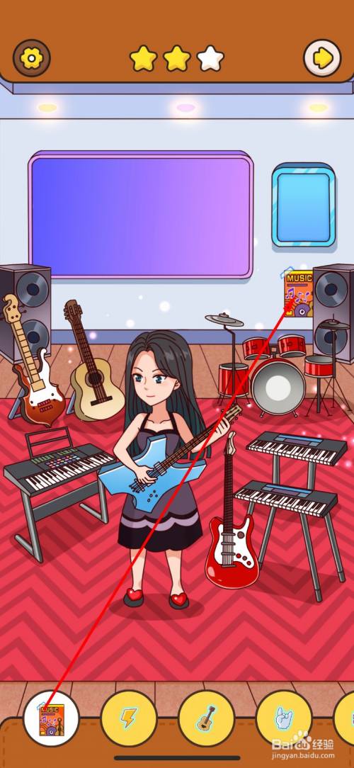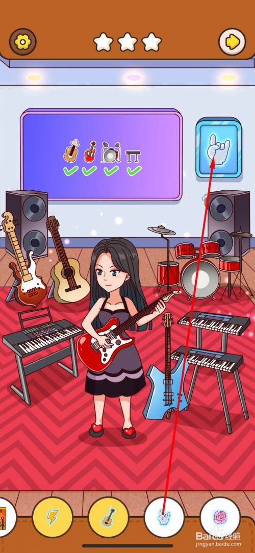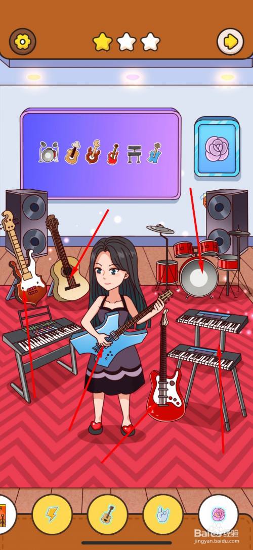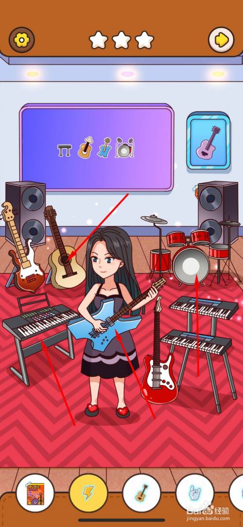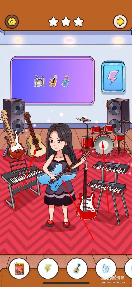 第三次仍是需要点击四件乐器,点击木吉他,红色电吉他,架子鼓,电子琴。