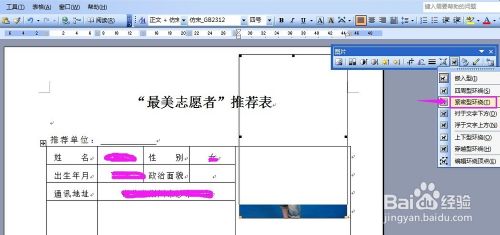 此刻照片还有别的一个问题,即照片的图片格局设置不准确,我们选中图片(用鼠标在照片上点一下),在图片中选择环抱体例;