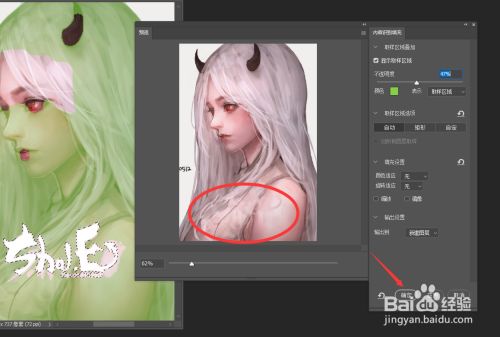 最后,在弹出的内容识别填充选项界面中,按图示进行设置参数,点击确定按钮。这样就完当作了人物图片中水印图案的删除操作。