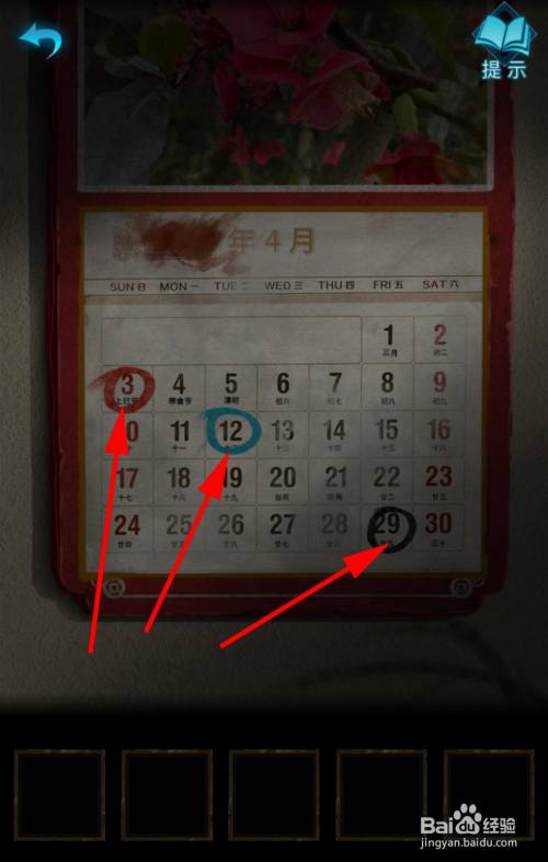接近后看到有3个被圈出来的日期,每个圆圈的颜色纷歧样,这就是打开挂历下面抽屉的密码。