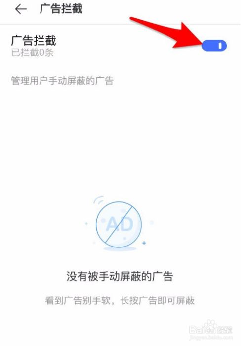 5、进入到“告白阻挡”界面后,找到“告白阻挡”这4个字右边的开关,点击它;
