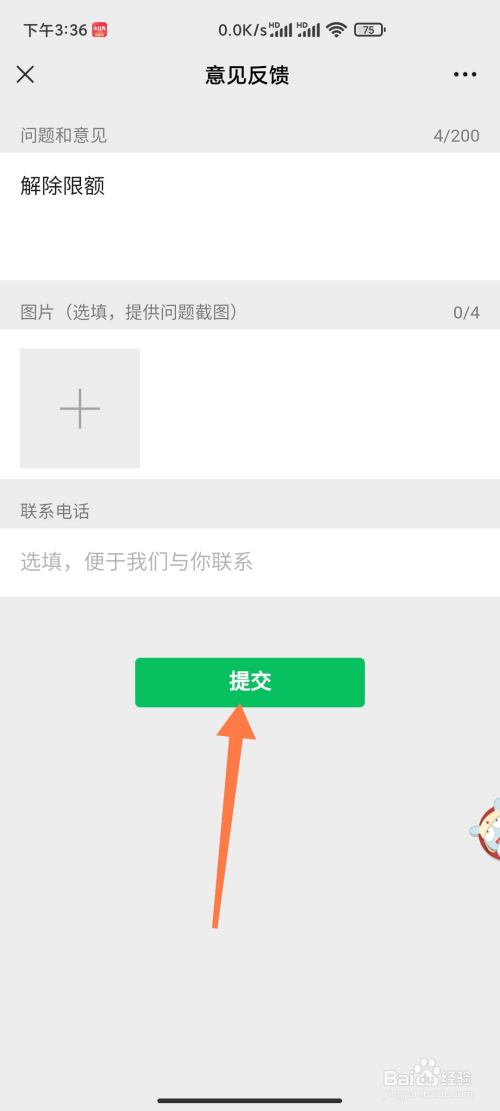 输入解除限额,上传图片,输入联系德律风,点击【提交】即可。