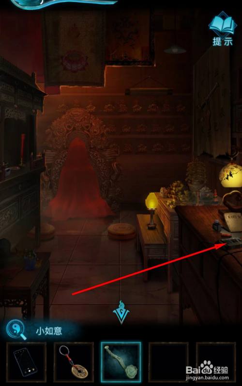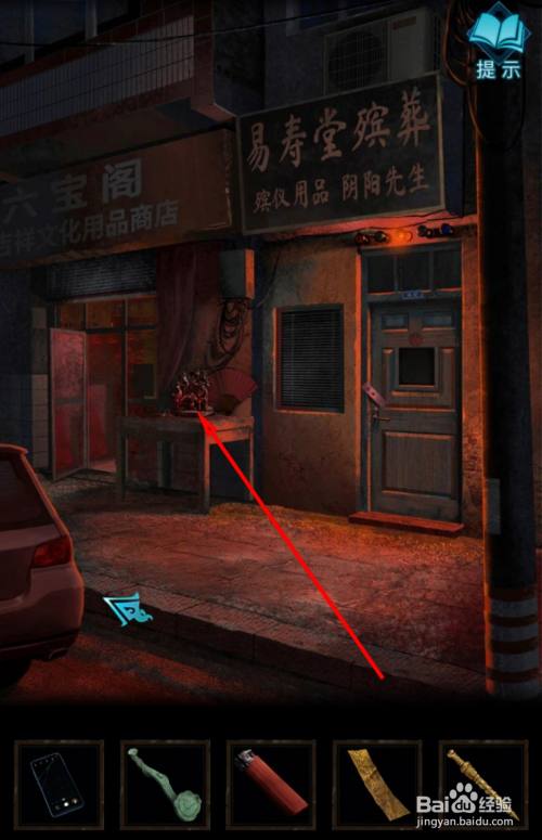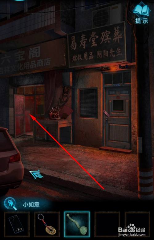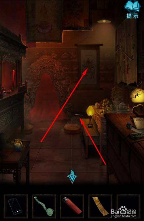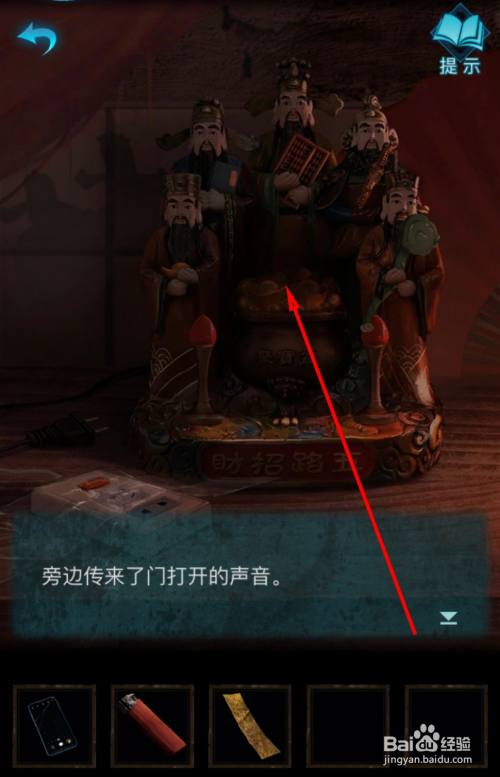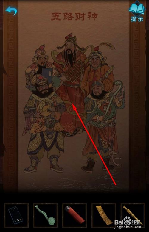 解开风水剑谜题后,拿起地上的小金鞭,再点击墙上的五路财神像图片。