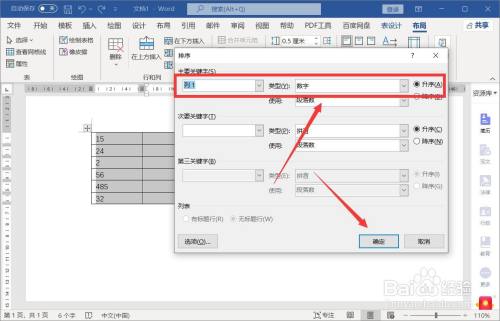 在弹出的窗口中选择对第一列进行排序,设置内容类型和挨次,点击【确定】即可。