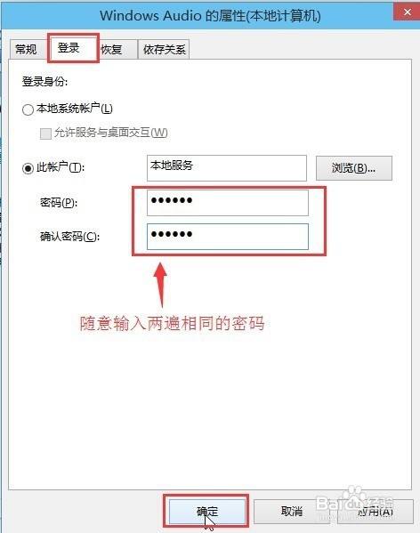 在Windows Audio的属性窗口中,单击以切换到“登录”项,然后点窜该帐户的密码。