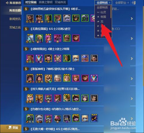 点击打开阵容推荐,点击选择时空裂痕,点击打开全部特质菜单,点击选择龙职业,点击打开龙阵容,查看金铲铲之战龙族装备的给予。