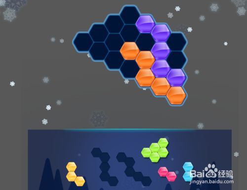 首先在整体的底部右端位置,放上橙色六边形拼块,如图。