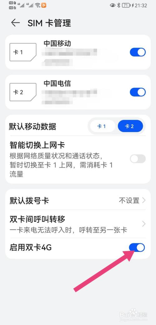 在卡办理页面,打开启用双卡4G即可封闭5G。