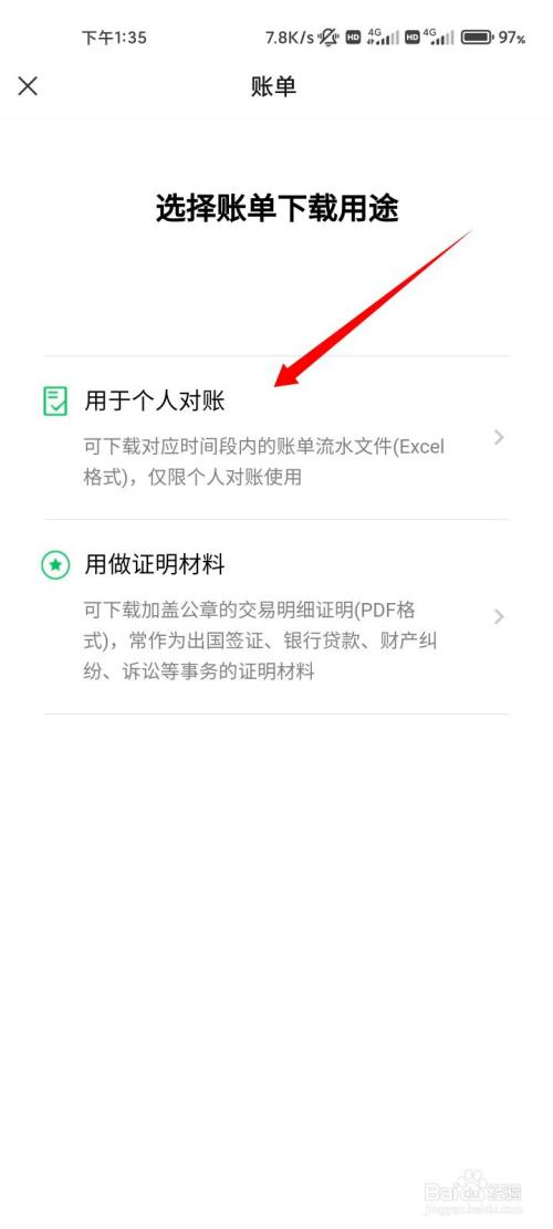 在页面中选择一个账单下载的用途。在这里,以用于小我对账为例。