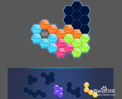 最后在黄色六边形拼块的右上侧,放上紫色六边形拼块挨着,如图,这样就顺遂通关了。