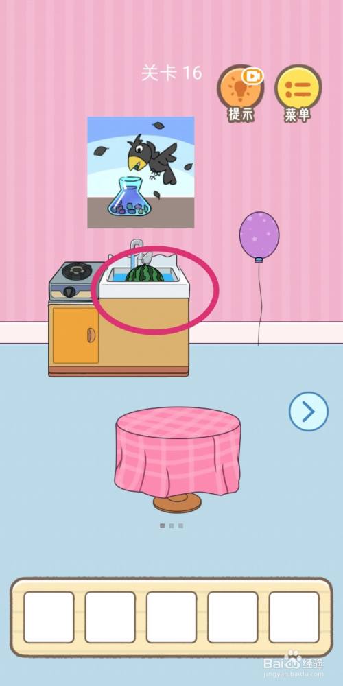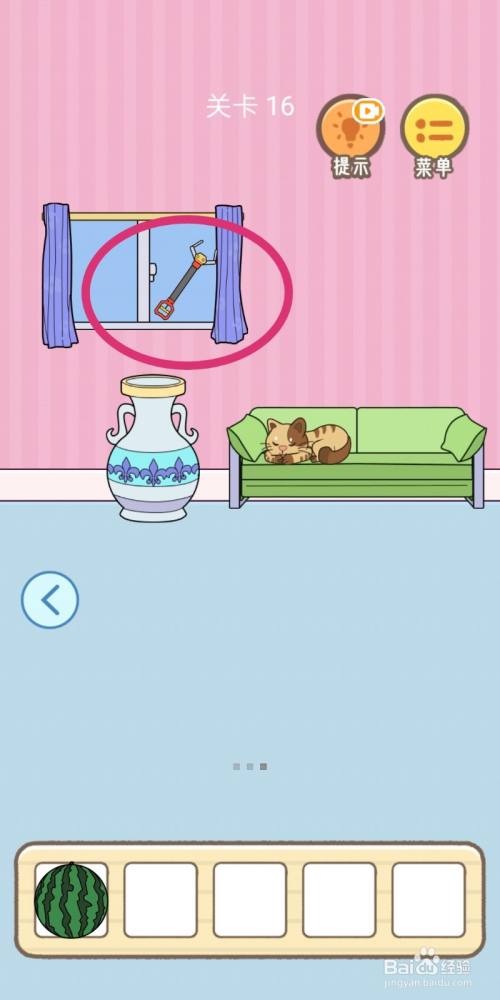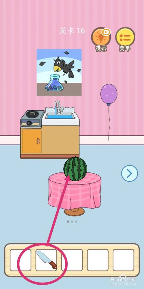 最后,把【西瓜】放到桌上,再用【生果刀】切开,游戏过关。