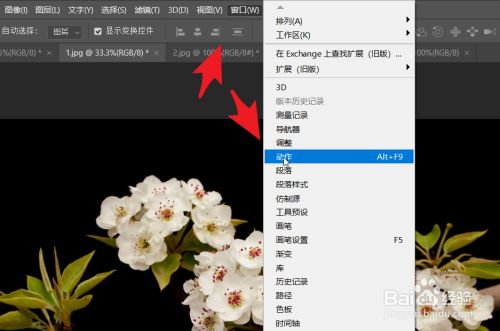 点击窗口菜单,然后找到箭头手指的动作选项,点击打开对照面板。
