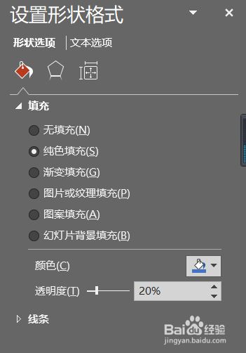 插入矩形后,在设置外形格局菜单中,将矩形的透明度设置为20%。