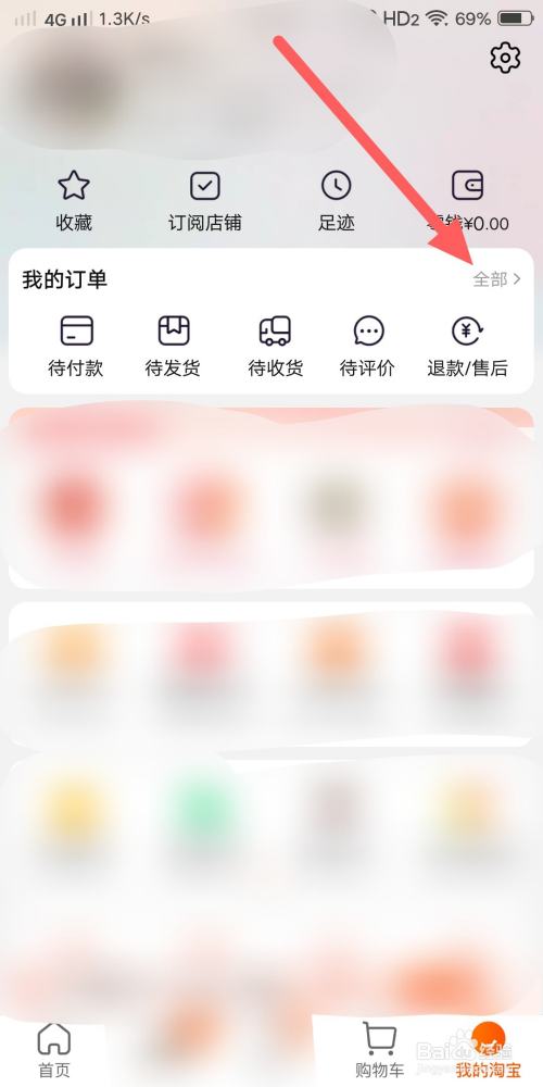 进入界面后点击我的淘宝按箭头指示再点击我的订单全数。