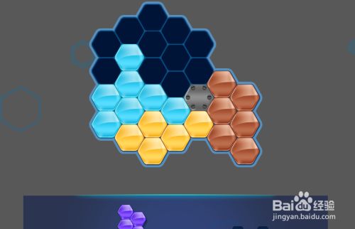 接着在棕色六边形拼块的左上侧,放上紫色六边形拼块挨着,如图。
