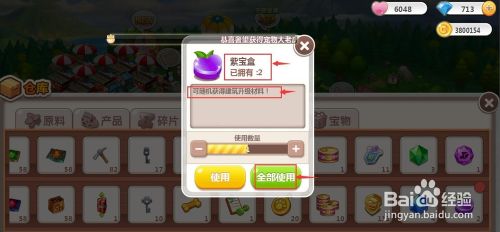 打开紫宝盒后,可以看到紫宝盒的数目,提醒开启后可随机获得建筑进级材料,我们点击全数利用;