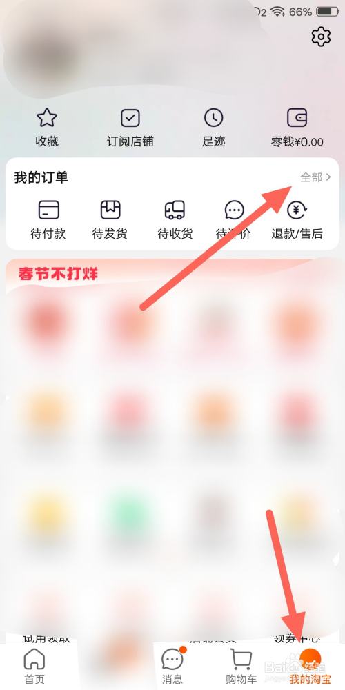 进入淘宝后点击我的淘宝按照箭头指示点击我的订单。