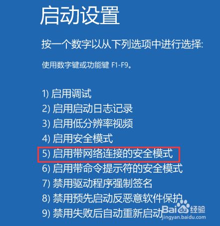 6、可以利用键盘选择一些启动选项,按4将启动到正常平安模式,按5将为您供给带收集的平安模式,按6将为您供给带号令提醒符的平安模式,这里我们按键盘上的5就可以进入平安模式了。