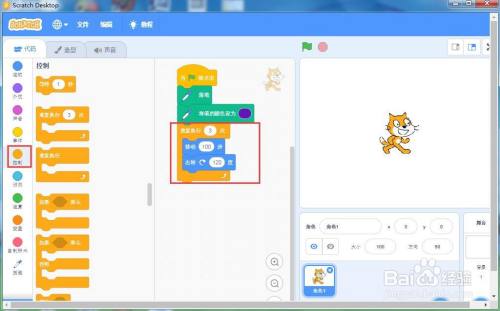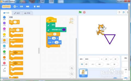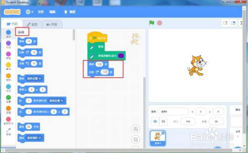 点击活动面板,添加移动100步,右转120度号令;
