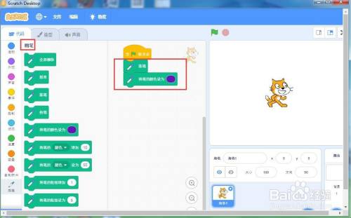 点击画笔面板,添加落笔、将笔颜色设为紫色号令;