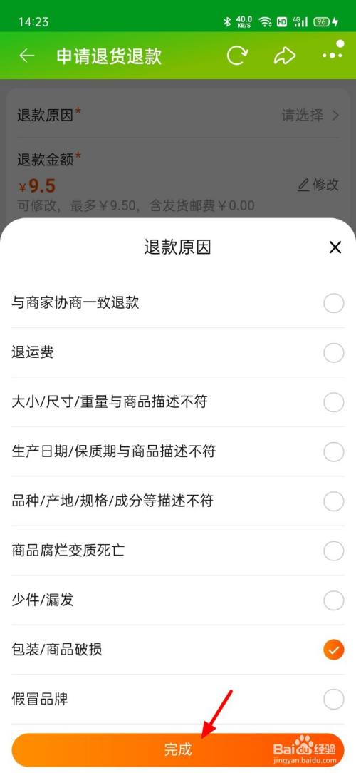 在退条目原因页面,勾选商品破损,点击完当作。