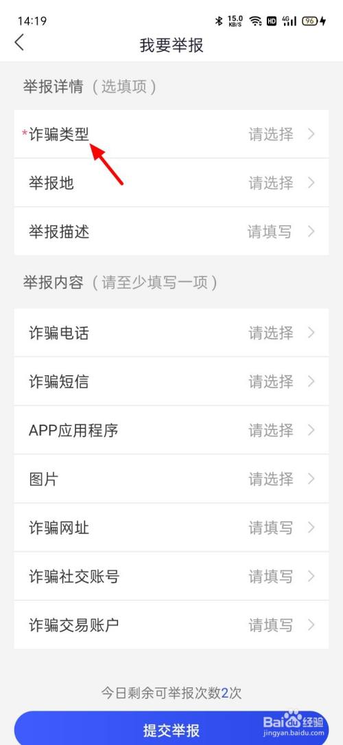 在我要举报界面,选中诈骗类型。