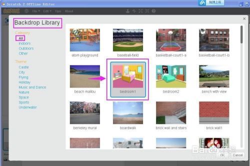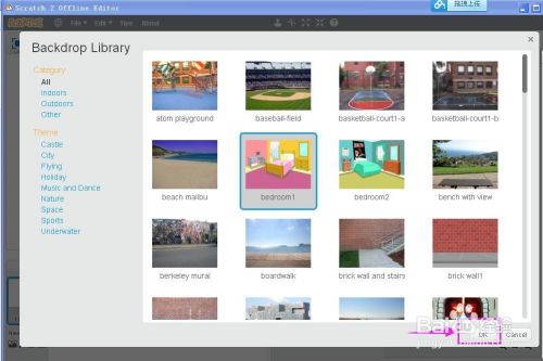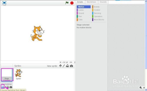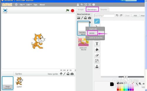 刚起头默认的白色布景若是不需要,可以在Backdrops布景中,找到白色布景,在上面按右键将其删除失落。