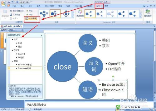 点击左侧三角形箭头或SMARTART东西——设计——文本空格,输入第三分支题目,按回车键添加同级文本。