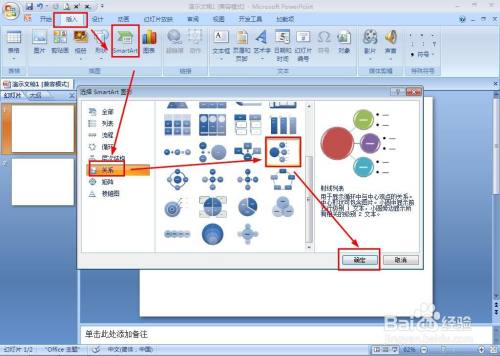 插入——插图——SMARTART——关系——射线列表图——确定。