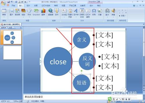 在二级的小圆文本框平分别输入:寄义、反义词、短语。