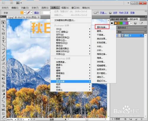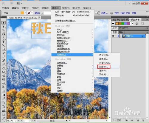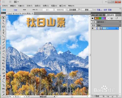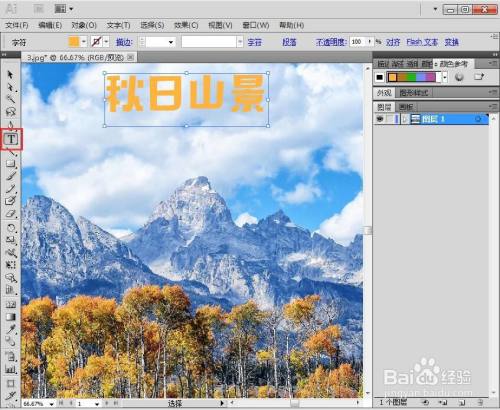 点击文字东西,选择橙色,输入秋天山景;