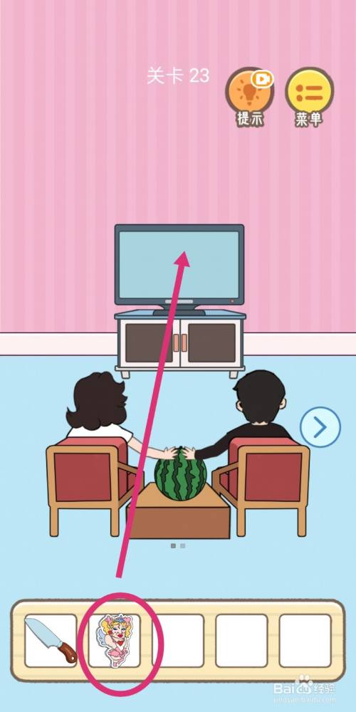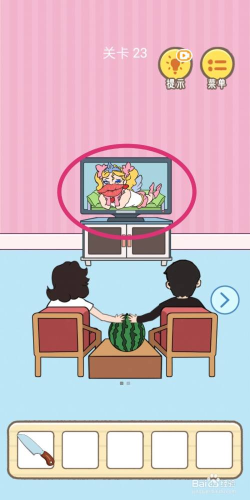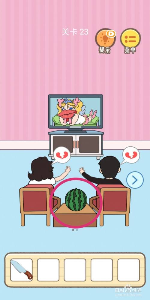 最后,再把【西瓜】放到桌子上,用【生果刀】切开,游戏过关。
