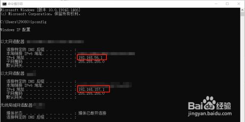 打开号令提醒符后,输入ipconfig回车,即可看到所有网卡的ip地址