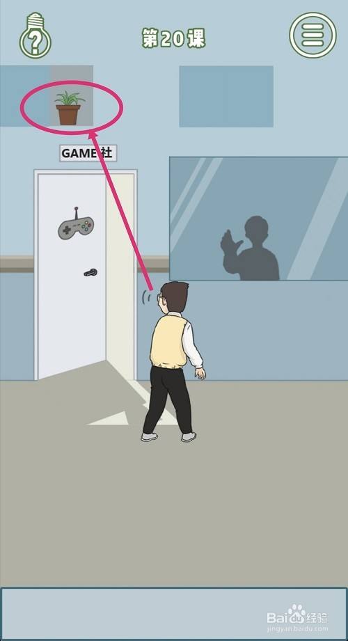 窗台上的花盆失落下来会砸到躲在门后的人,然后点击教室门。