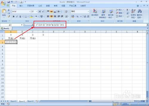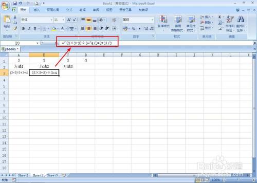 选择B3单位格——输入公式:="(3×3+3)÷3="&(3*3+3)/3——回车确定,显示出:(3×3+3)÷3=4