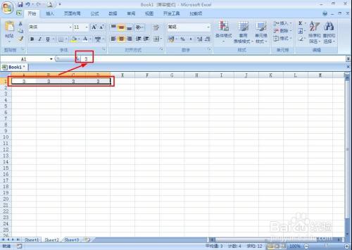 选择A1:D1单位格规模——在公式栏输入3——同时按Ctrl+回车键。