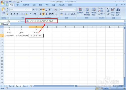 选择C3单位格,输入公式:="3^(3-3)+3="&3^(3-3)+3——回车确定,显示:3^(3-3)+3=4