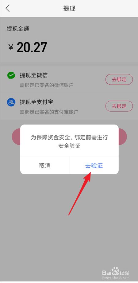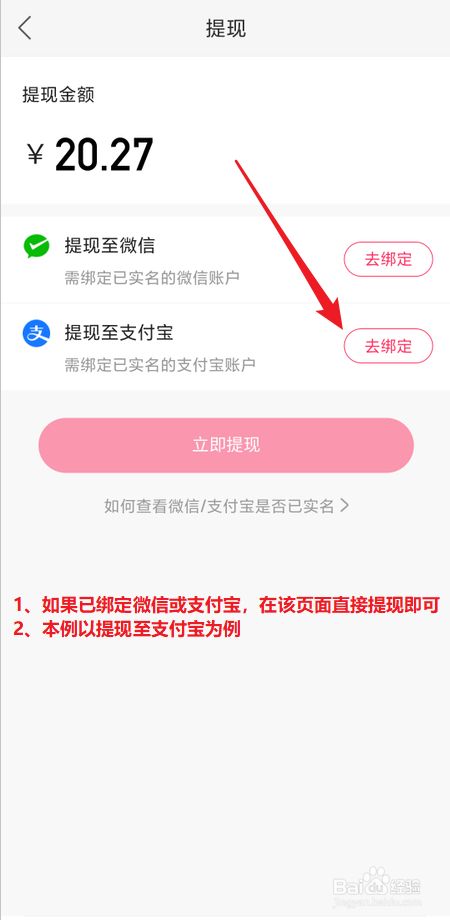在提现界面上点击【去绑定】按钮(若是已绑定,在该页面可直接提现。本例以提现至支付宝为例)。