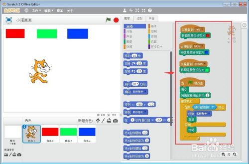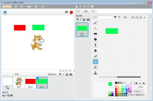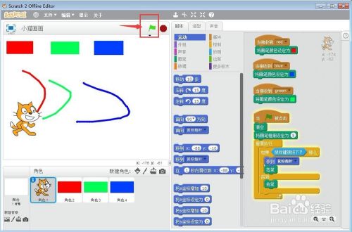 点击绿旗执行程序,我们用鼠标点击某种颜色,就可以让小猫用这种颜色在舞台上画画了。