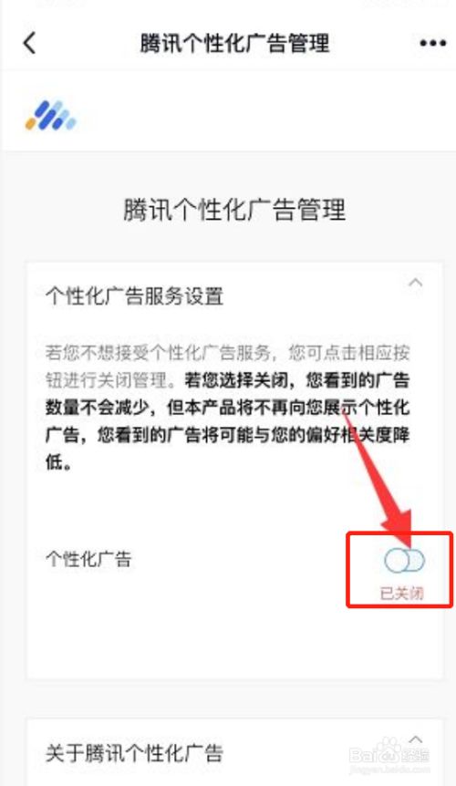 最后在告白保举设置页面里,找到个性化告白,封闭后方的开关按钮即可。
