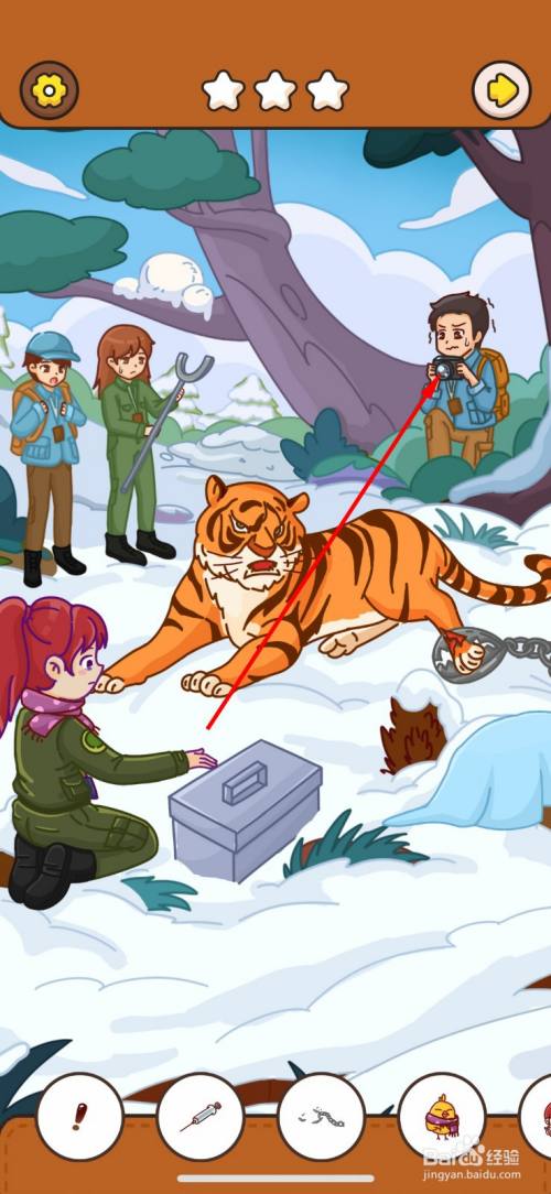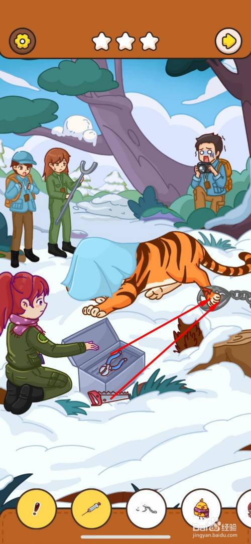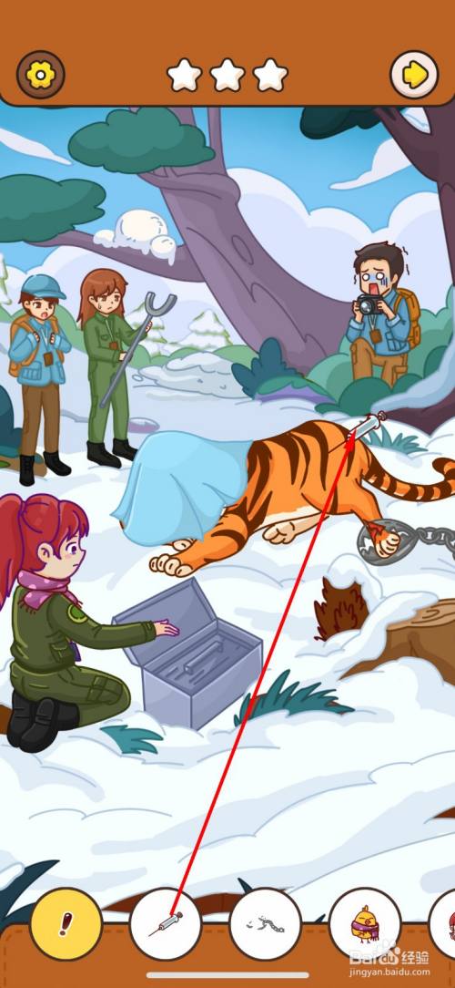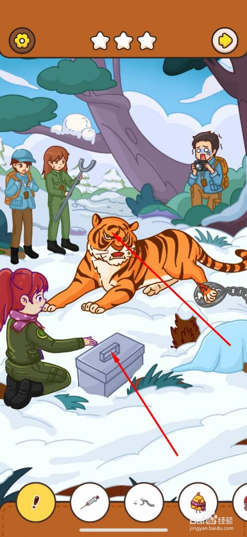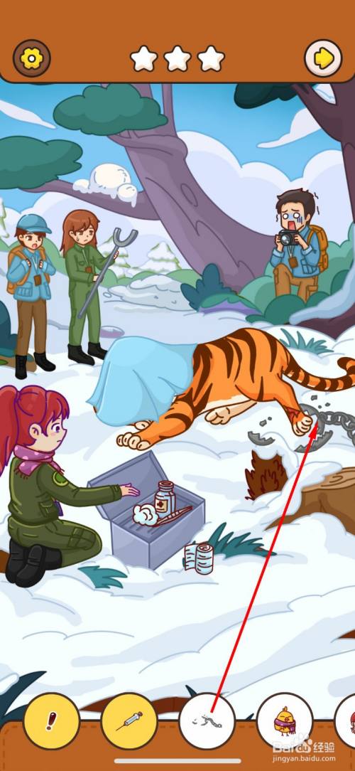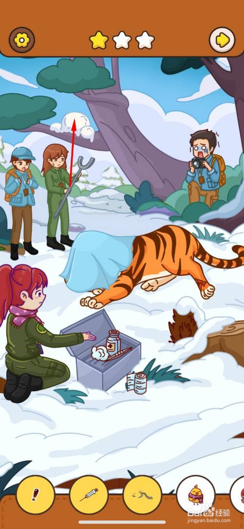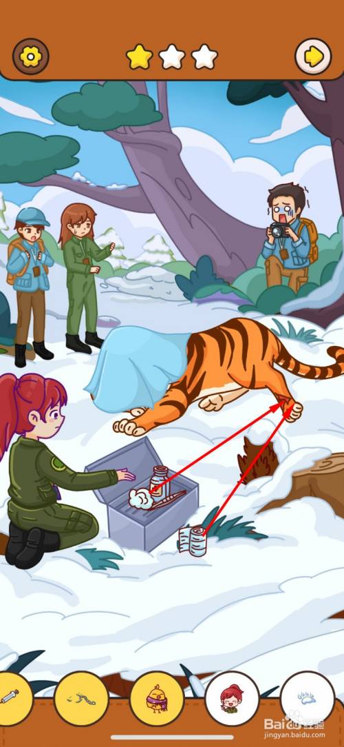 将雪地上的毯子拖动到山君头上,并点击急救箱打开盖子。