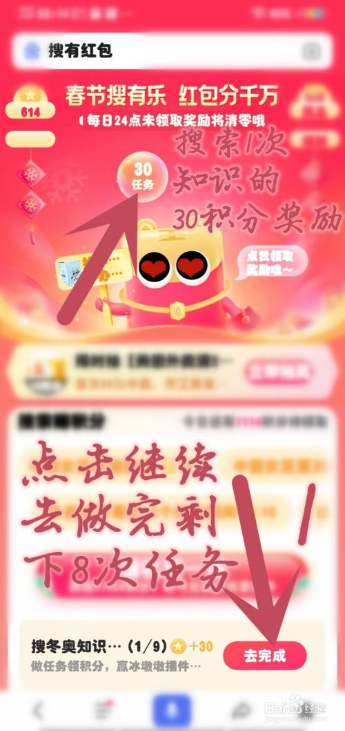 工具/原料vivoZ3V1813BTAndroid9百度13.3.0.11方式/步骤1点击手机桌面上的软件登录。2点击搜冬奥常识去完当作。3看到主动领30积分点击红包进入领取积分。4点击继续去做完剩下8次使命。5点击红包卡通领取270使命积分奖励。END注重事项按划定的搜刮可以获得大量积分奖励。