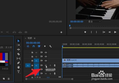然后点击音轨,选定视频上的音轨,再点击箭头所指的静音轨道按钮。