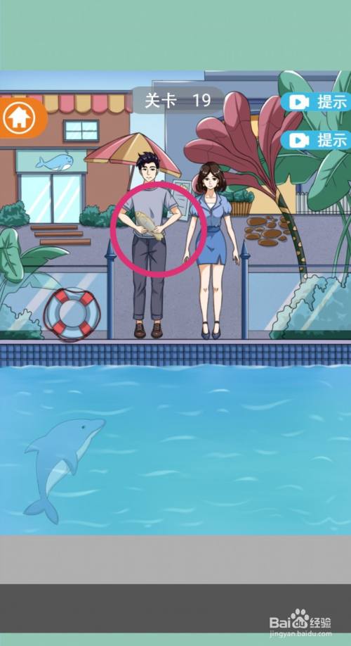 把【小鱼】给男本家儿角,男本家儿角就会用鱼喂水中的海豚。