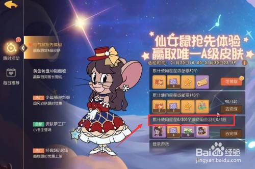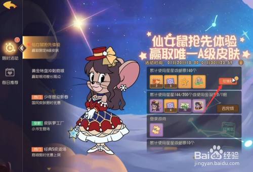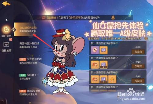 工具/原料华为mate40EMUI11.1.0猫和老鼠2.0.3方式/步骤1打开游戏活动,选择点击左侧的限时活动。2选择点击左侧的仙女鼠的获取活动。3在活动中需要完当作累计利用星星200个或利用金羽毛1根的使命。4完当作使命点击右侧的领取,领取完毕即可获得仙女鼠。END注重事项在活动中需要完当作累计利用星星200个或利用金羽毛1根的使命。