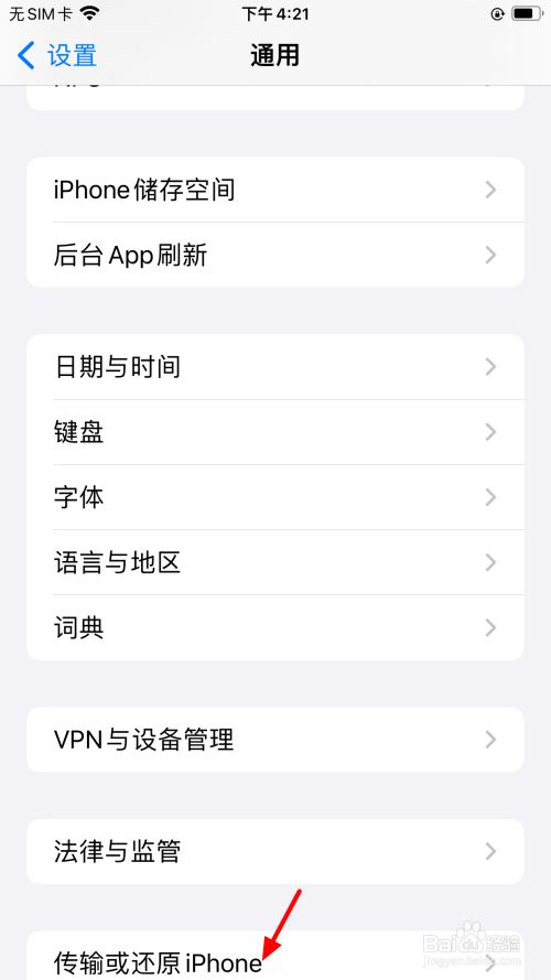 在通用页面,点击传输或还原iPhone。