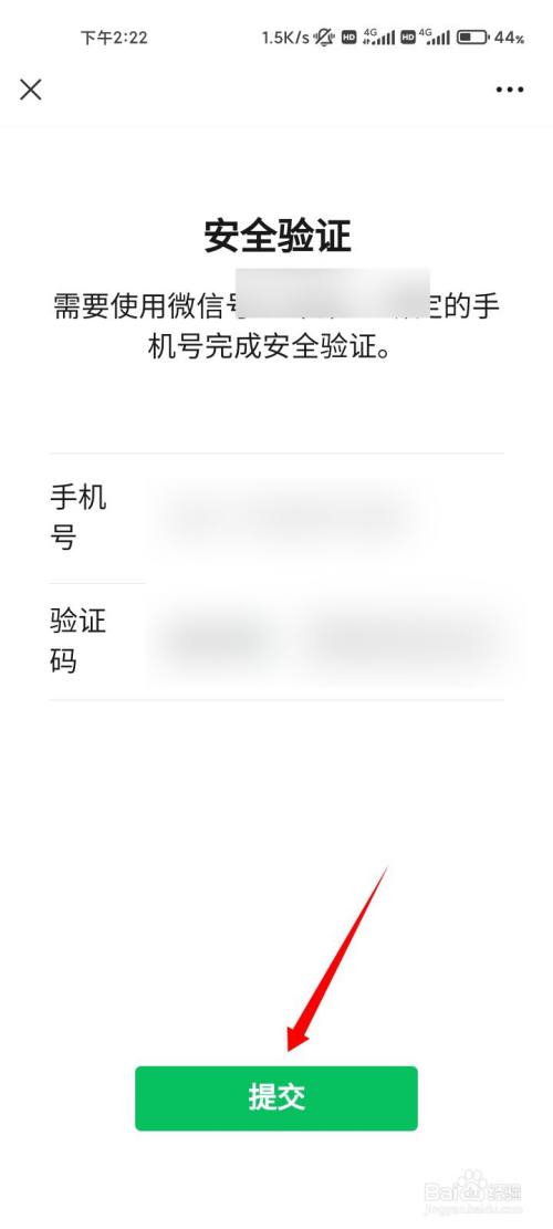 输入当前微旌旗灯号绑定的手机号和验证码,点击提交的按钮。